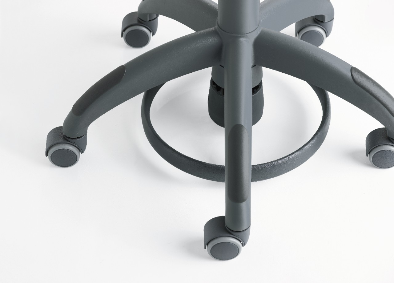 The Hugo stool can be flexibly adjusted to fit the height of each user. The foot ring of Hugo Manual Plus enables even small members of the practice team to work in an ergonomic way on the same level as the tall ones