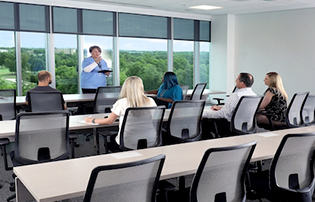 Dentsply Sirona Academy, Charlotte has eight distinct training rooms. Each training room is equipped with a projector, screen, lecturn with a stationary microphone, a lavalier microphone, and a handheld microphone. Tables have power outlets to keep your laptops and mobile devices charged throughout the course. Most rooms are setup for 25 people in classroom style, but certain rooms combine to allow seating for 50.